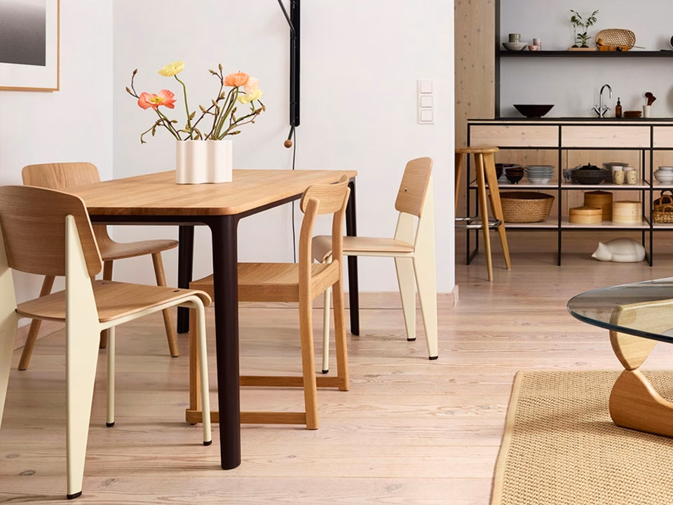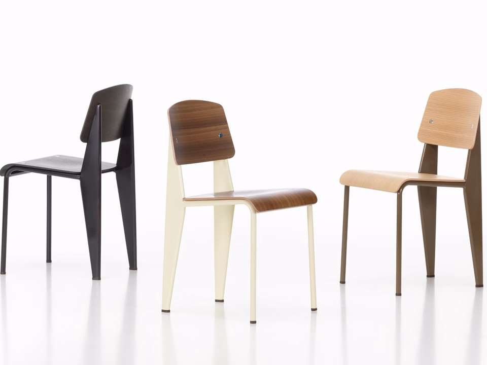 The Standard chair by Jean Prouvé has evolved into one of the most famous classics of the French ‘constructeur’. The seat and backrest of this understated, iconic chair are available in various types of wood, and the metal frame comes in different colours.