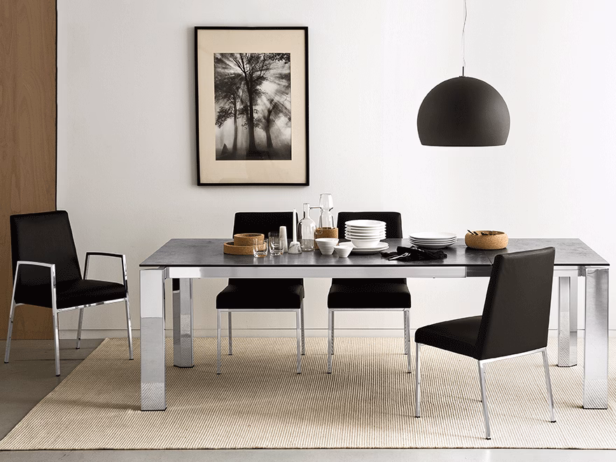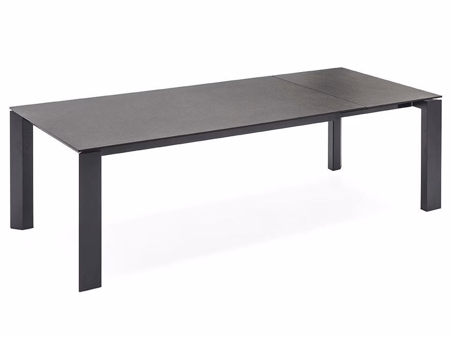 GATE includes an extension system with guides mounted on the frame: by pulling out the frame, the two legs slide to one side allowing the extension leaf, mounted on metal guides, to lift, twist into position and line up with the top with a simple movement. Legs always remain at the corners of the table offering maximum comfort to all guests.