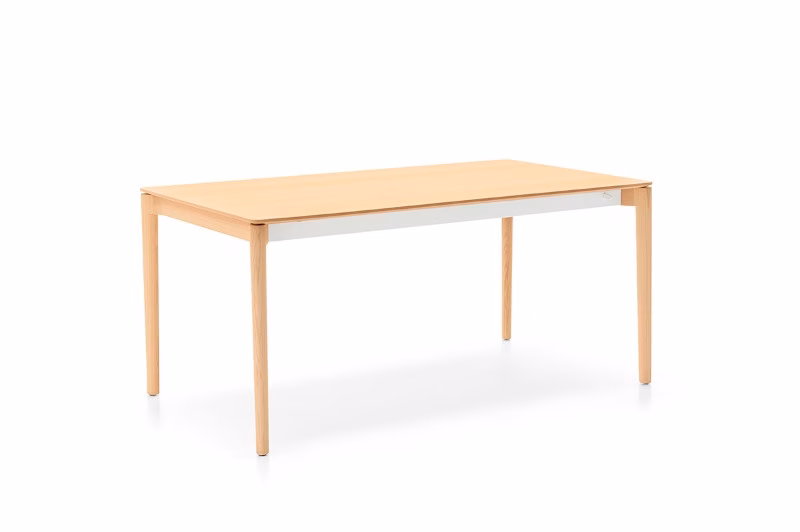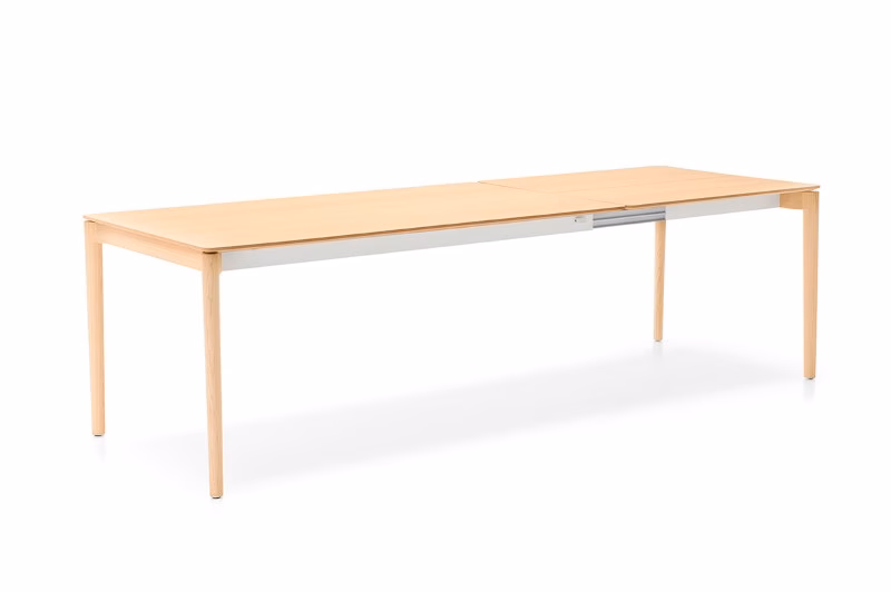 With its minimalist aesthetic and bevelled edges, the NORDIC table takes its cues from Scandinavian design and makes use of rich materials and shapes that entice the eye. The exquisitely beautiful solid wood beam is not only a visual delight, it also serves a structural purpose, seamlessly accommodating the shapely slender legs and the aluminium guides.