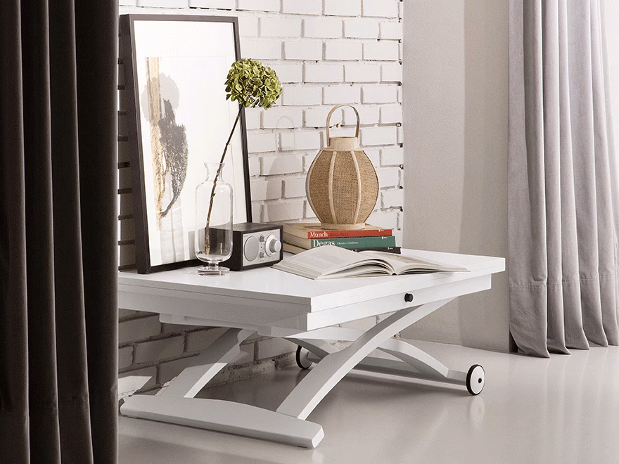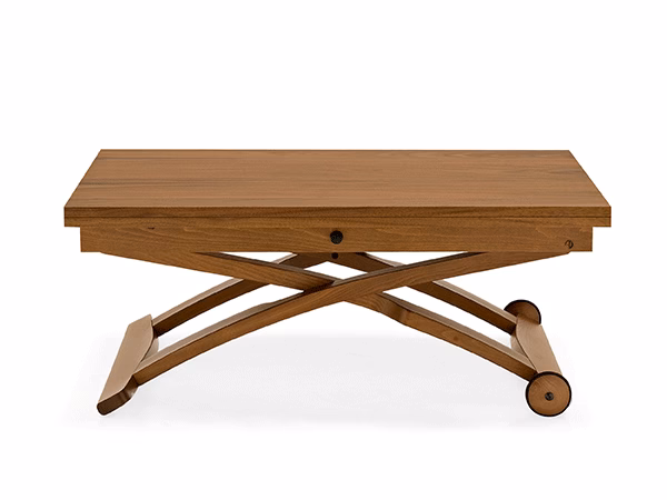MASCOTTE model coffee table, entirely of wood. Extendable and height-adjustable. MASCOTTE is a versatile coffee table for your living area which, if necessary, and with just a few movements, turns into a dining table for 6 guests: just press a button, placed on the long side, to adjust the height to 7 different positions. The wooden top can double its length thanks to the practical butterfly opening mechanism. Easy to move thanks to two soft scratch-resistant rubber wheels, the MASCOTTE coffee table loves simply to be there and to transform within the home environment according to your needs.