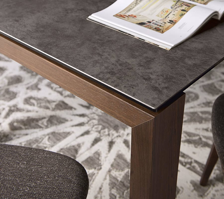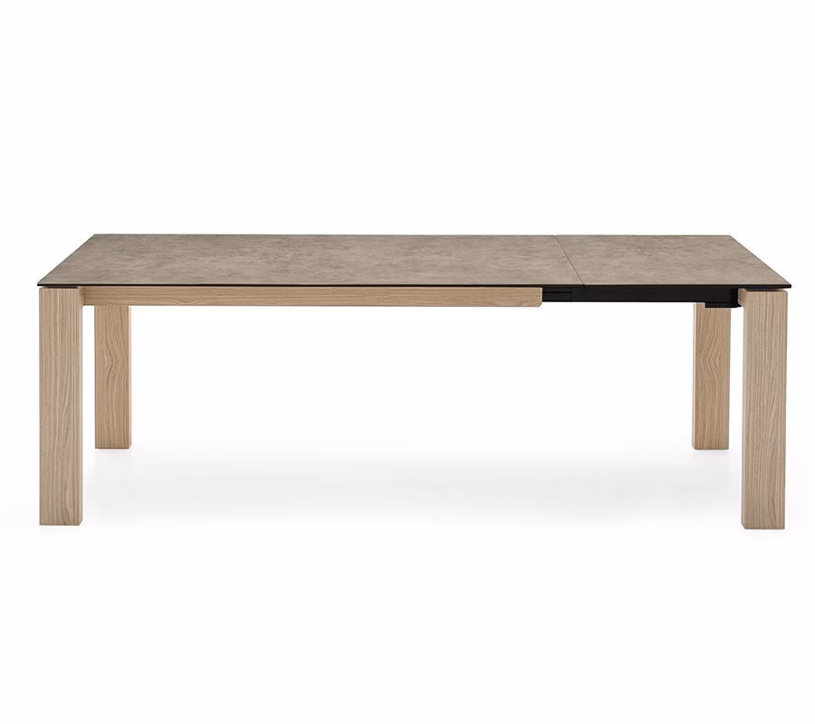 SIGMA extendable table: structure and perimeter legs in wood. Rectangular top in wood or tempered glass. The SIGMA table contains an ingenious mechanism capable of extending the support surface. Pulling the structure towards you, the two legs with hidden wheels slide on one side allowing you to extract the extension. With a simple rotating movement, the extension mounted on metal rails leaves its housing and aligns with the floor. The rectangular section legs are always perimeter ensuring maximum comfort to all diners.
