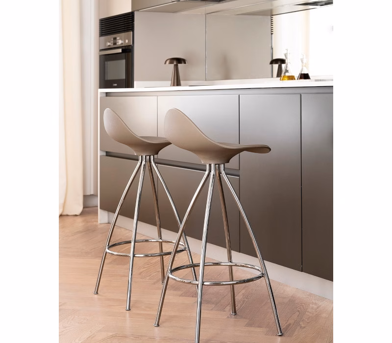 The stool skin and shell are moulded simultaneously, forming a final product of two different materials, densities and colours. An overall rich and elegant proposal. Onda comes with a chromed steel frame for indoor use and a stainless steel structure for outdoor use.
