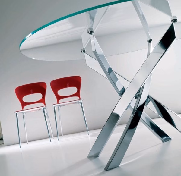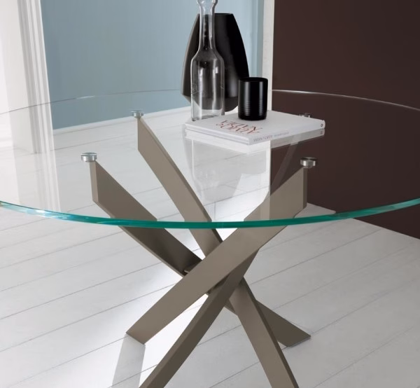 Round fix table with metal lacquered frame available in various colours. Top in lacquered wood, glossy glass or velvet matt anti-scratch glass.