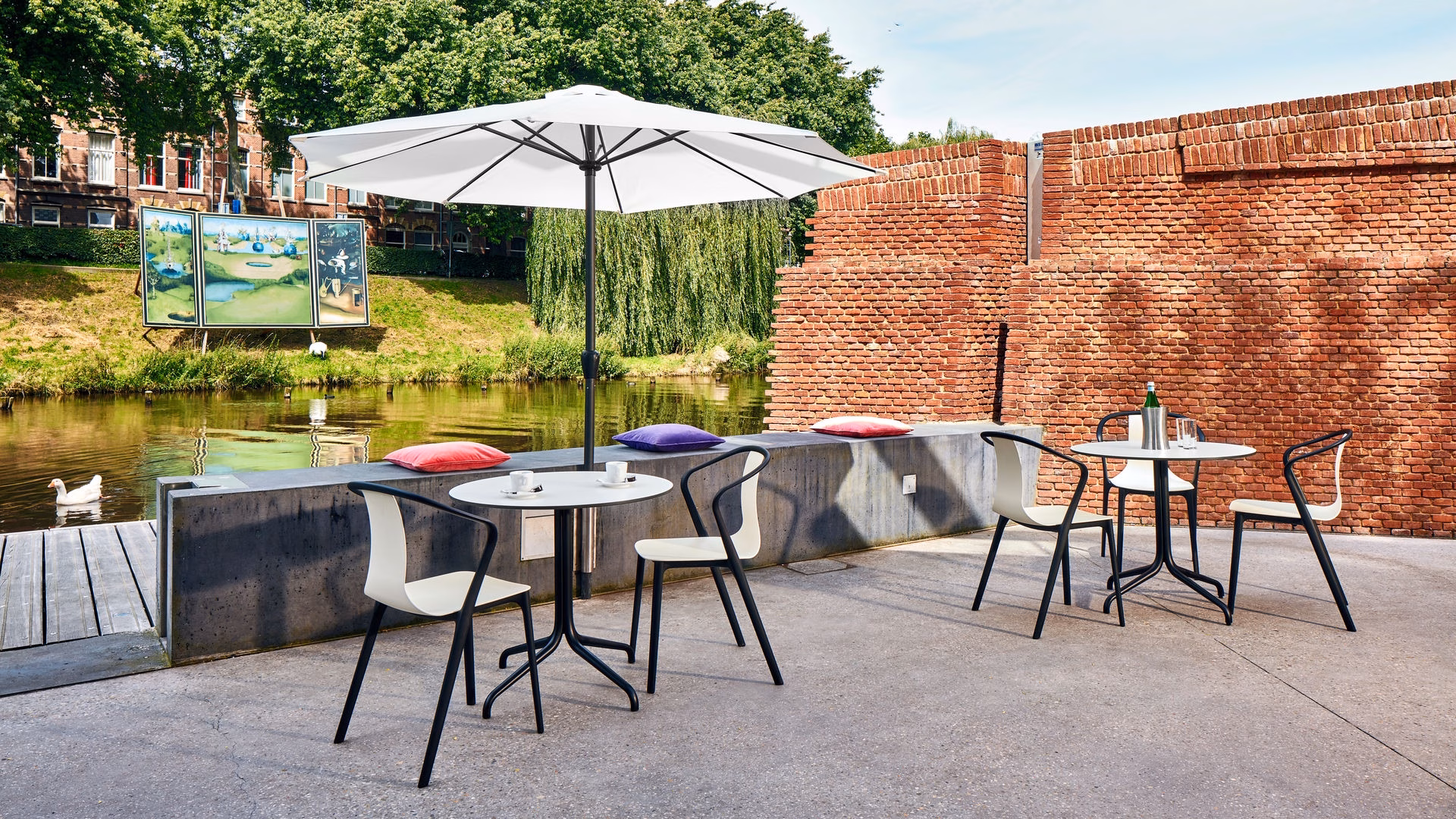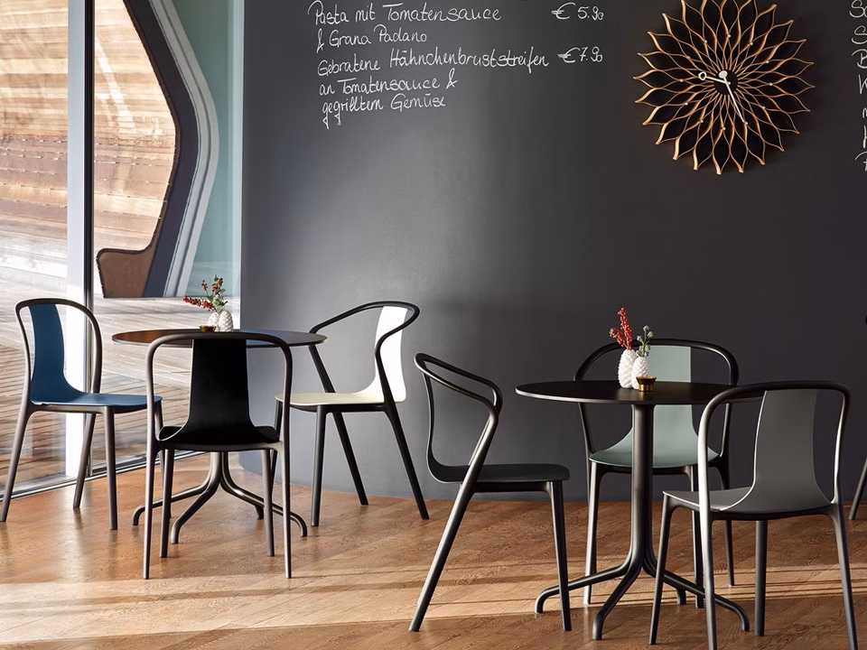 The elegant Belleville Table by Ronan and Erwan Bouroullec comes in a number of different variations modelled on the classic bistro table. The smaller bistro tables, with round or square tops, are available in different versions, some suited for both indoor and outdoor use. The Belleville Table also comes with a rectangular top in various widths and lengths..