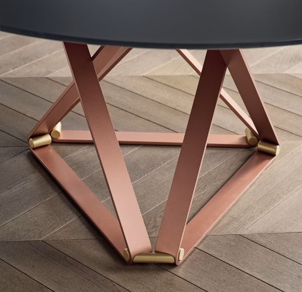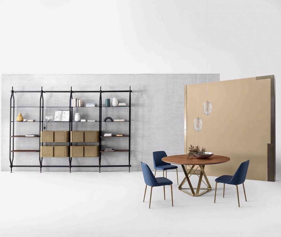 Bontempi Casa Delta round dinning table with lacquered metal frame and decorative details. Top in Veener Wood, Glossy glass, Velvet matt anti-scratch lacquered glass and SuperMarble.
