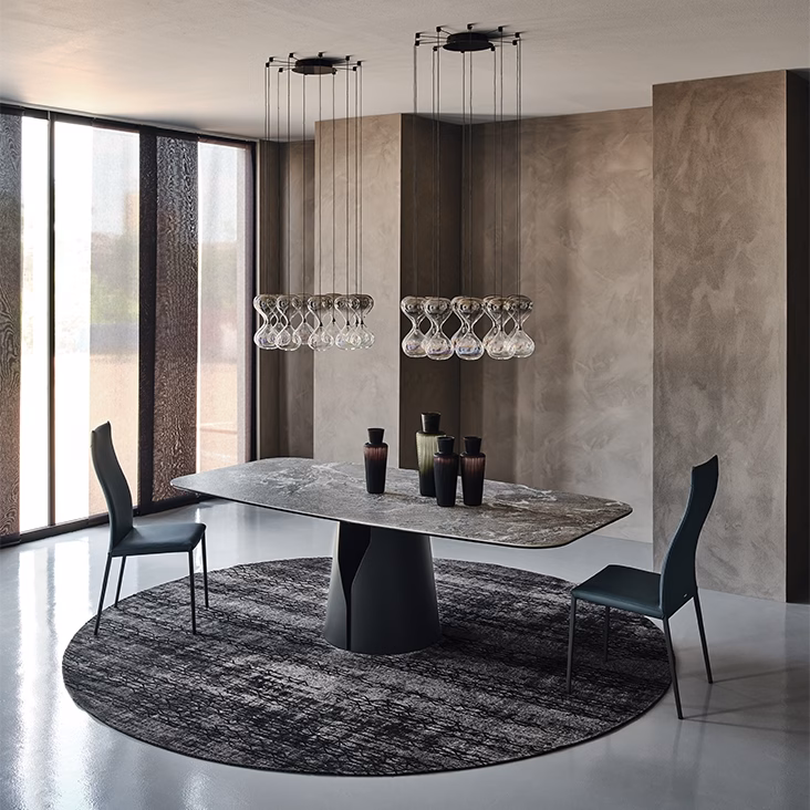 Table with base in titanium (GFM11), bronze (GFM18), graphite (GFM69), white (GFM71) or black (GFM73) embossed lacquered steel. Marmi Alabastro (KM02), Supreme (KM03), Ardesia (KM04), matt Golden Calacatta (KM05), glossy Golden Calacatta (KM06), matt Portoro (KM07), glossy Portoro (KM08), glossy Sahara Noir (KM09), Emperador (KM10), Makalu (KM11), Breccia (KM12) or Arenal (KM13) ceramic top. Optional central swiveling tray Lazy Susan.