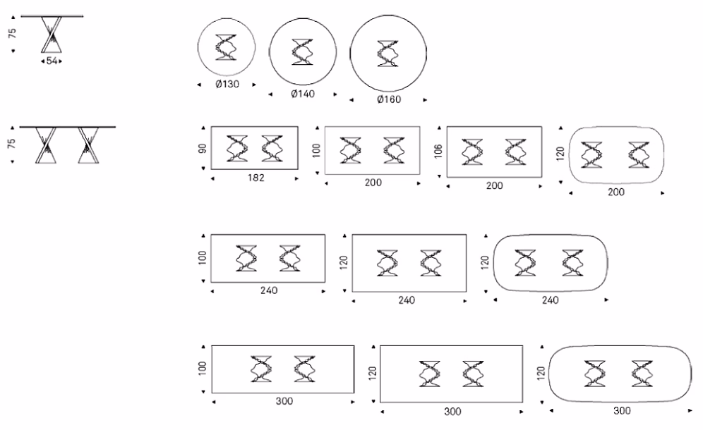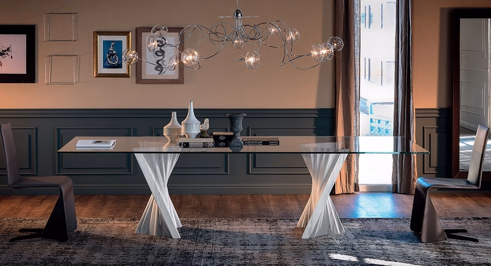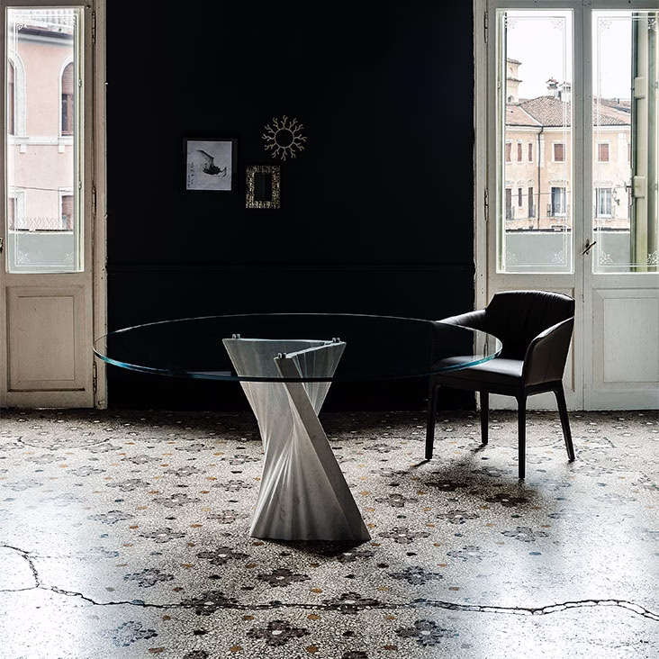 Table with base in matt Palissandro white marble (BPO). Top in 15mm clear or extra clear glass. Glass top in 12mm on 182×90 and 200×106 versions. Top with plates in 1 base version, top laid on the base in 2 bases version.