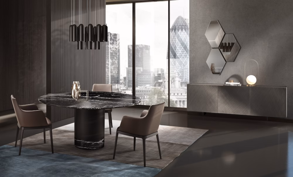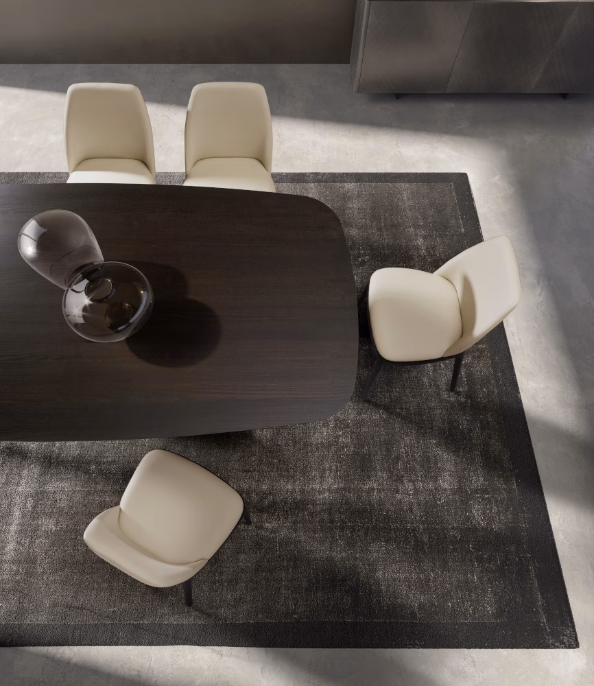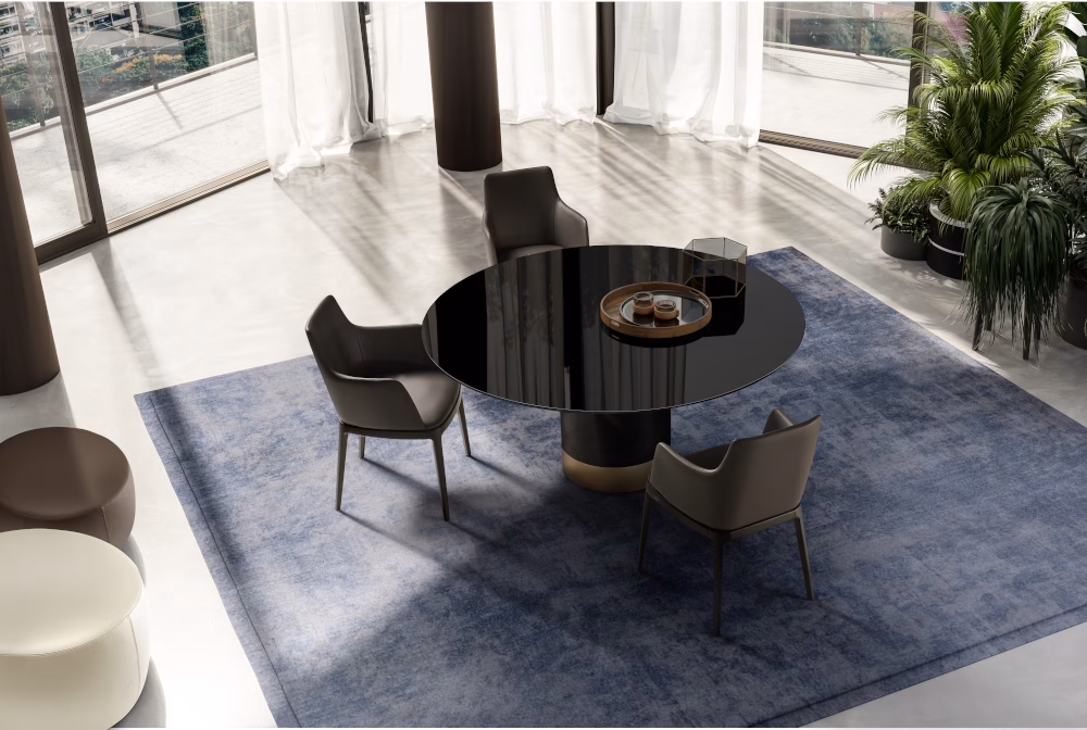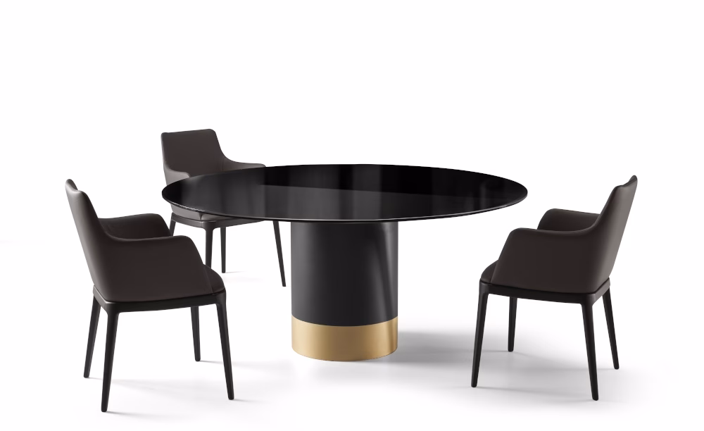 Table with painted metal base monocolour or bicolour (**Please note, marble top tables only comes in bicolour**) and top in tempered glossy painted black glass, round, rectangular or shaped ,12 mm thickness. Top size 240×120 and 300×120/320×130 have a thickness of 15 mm. Veneered wood top 38 mm tickness. Ceramic round, rectangular or shaped, 16 mm thickness. 10 mm thick tempered glass, coupled with a 6 mm thick ceramic top. Marble top round, rectangular or shaped, with oblique edges with 20 mm thickness.