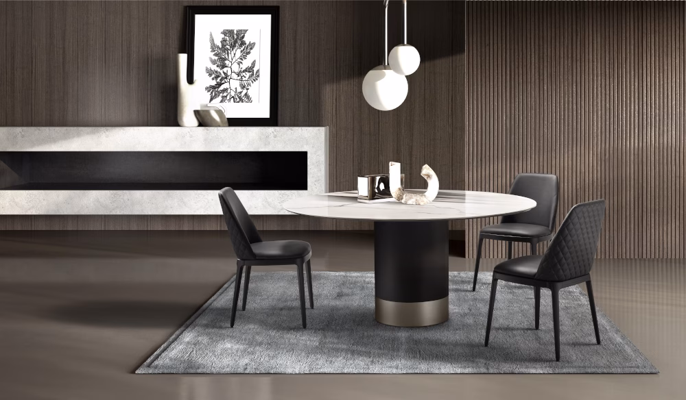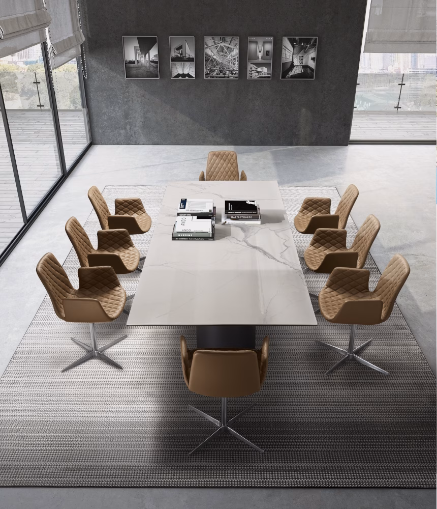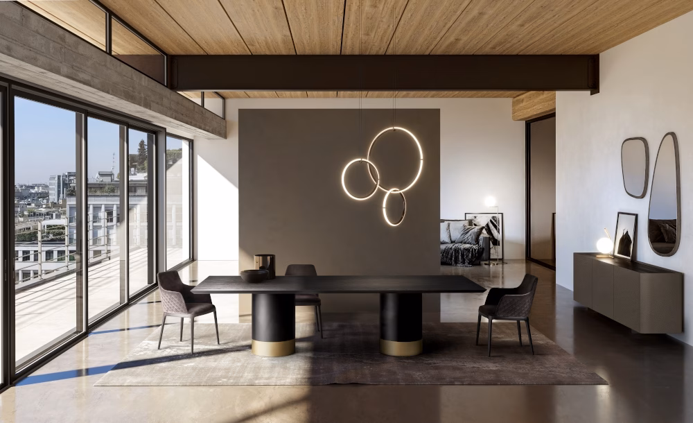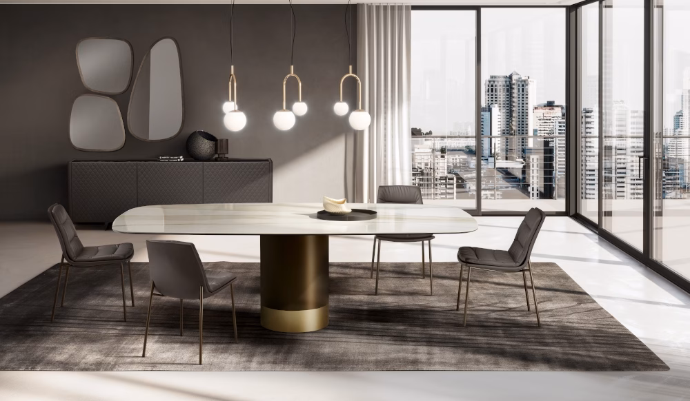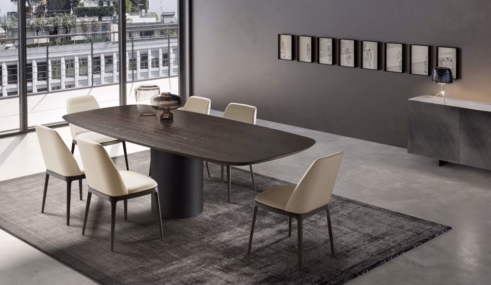 Table with painted metal base monocolour or bicolour (**Please note, marble top tables only comes in bicolour**) and top in tempered glossy painted black glass, round, rectangular or shaped ,12 mm thickness. Top size 240×120 and 300×120/320×130 have a thickness of 15 mm. Veneered wood top 38 mm tickness. Ceramic round, rectangular or shaped, 16 mm thickness. 10 mm thick tempered glass, coupled with a 6 mm thick ceramic top. Marble top round, rectangular or shaped, with oblique edges with 20 mm thickness.