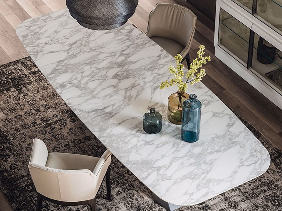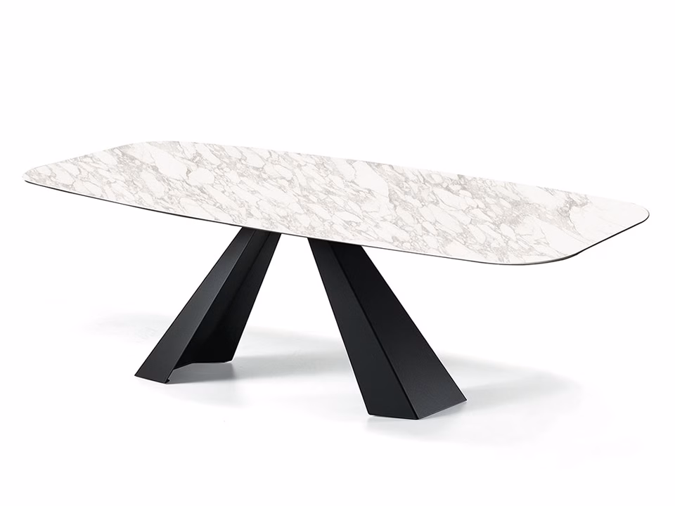 Table with base in titanium (GFM11), bronze (GFM18), graphite (GFM69), white (GFM71) or black (GFM73) embossed lacquered steel. Marmi Alabastro (KM02), Supreme (KM03), Ardesia (KM04), matt Golden Calacatta (KM05), glossy Golden Calacatta (KM06), matt Portoro (KM07), glossy Portoro (KM08), glossy Sahara Noir (KM09), Emperador (KM10), Makalu (KM11), Breccia (KM12) or Arenal (KM13) ceramic top.