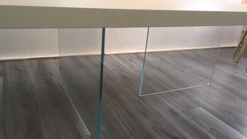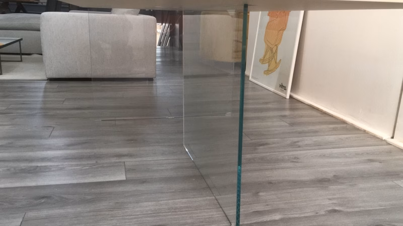 Essential and surprising, the Air table seems to float in the air. Two almost invisible glass legs support the table top, which seems suspended in mid air. The extra-clear tempered glass creates a sensation of airiness and brings light to the room. The table top is available in a range of finishes, each one capable of filling the interior with personality: from the warmth of wood in the Wildwood version to the refinement of coloured glass, the Air table complements different contexts and styles with originality.