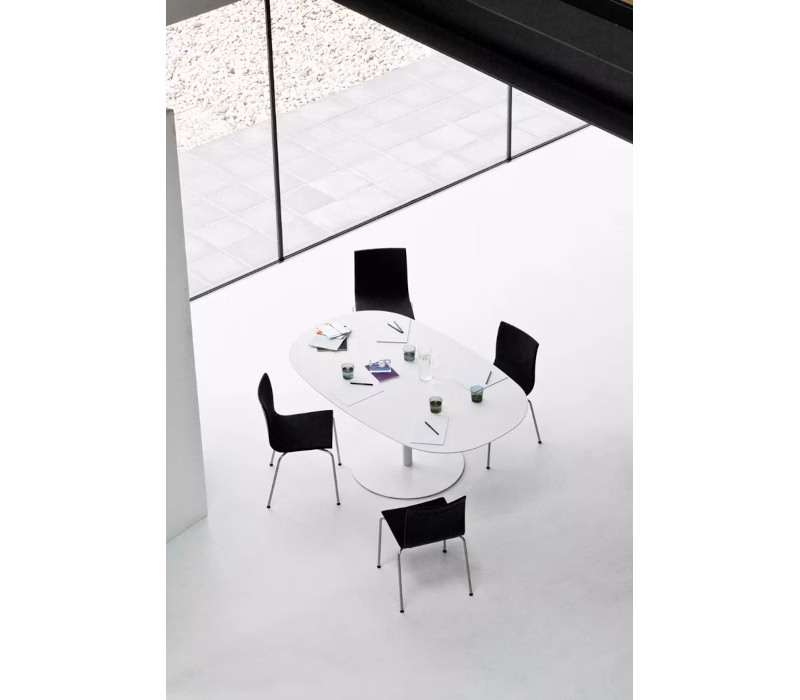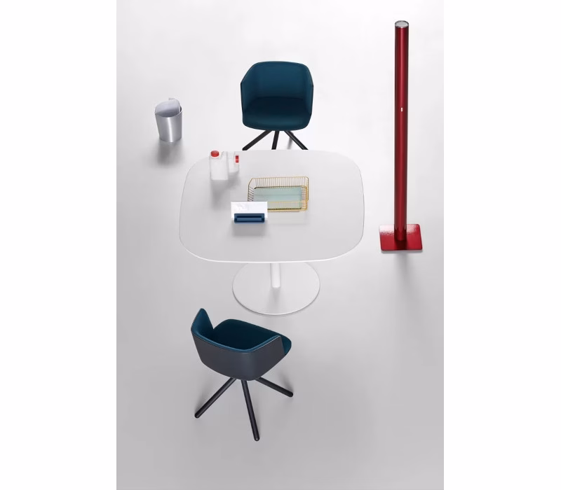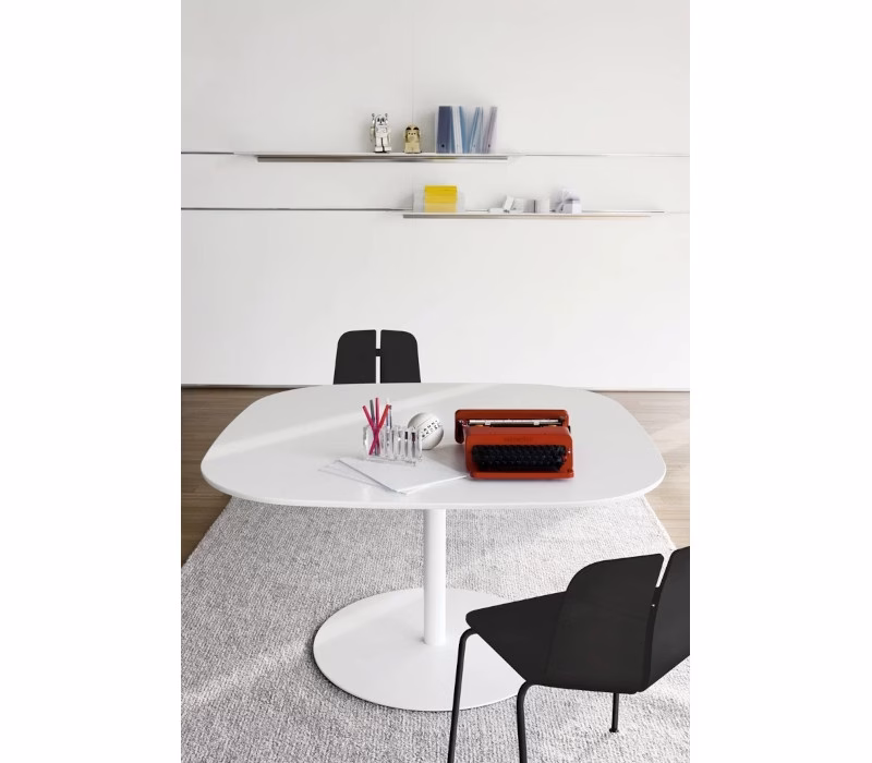 A column with a world around it. The RONDÒ table harmoniously develops a minimalist theme, with a central support for the tabletop. Its profile is rounded, also in the square version. Its adjustable height and colour choices, from rigorous black and white to the warm appeal of wood, create a host of solutions offering sheer elegance.