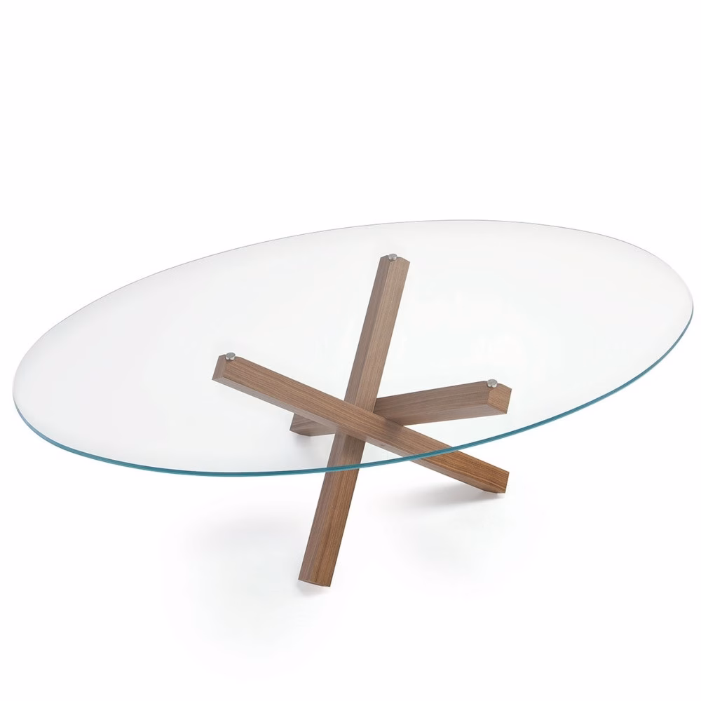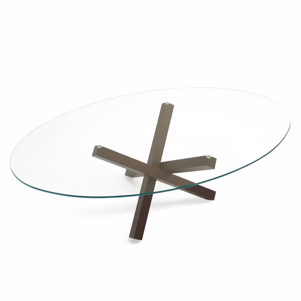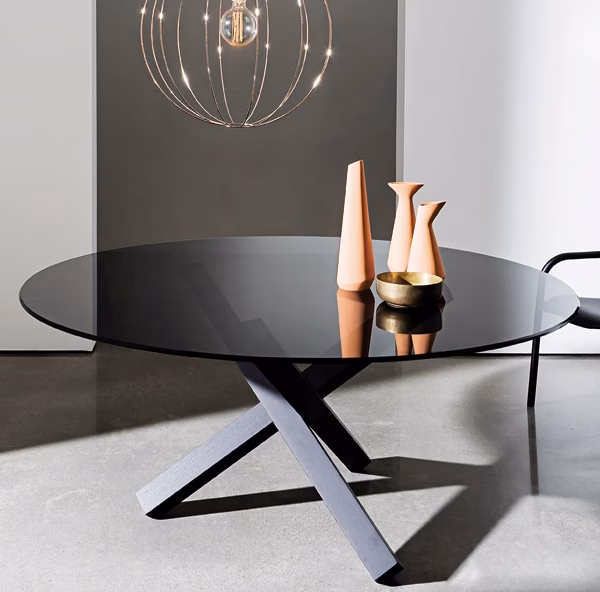 This table becomes a protagonist in daily life in any space. The harmonious lines crossing of the base in wood wenge finish or plated in polished chrome is completed by a round top. Oval or polygonal tops also available. Please contact the store for details.