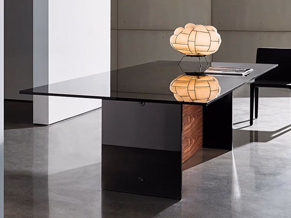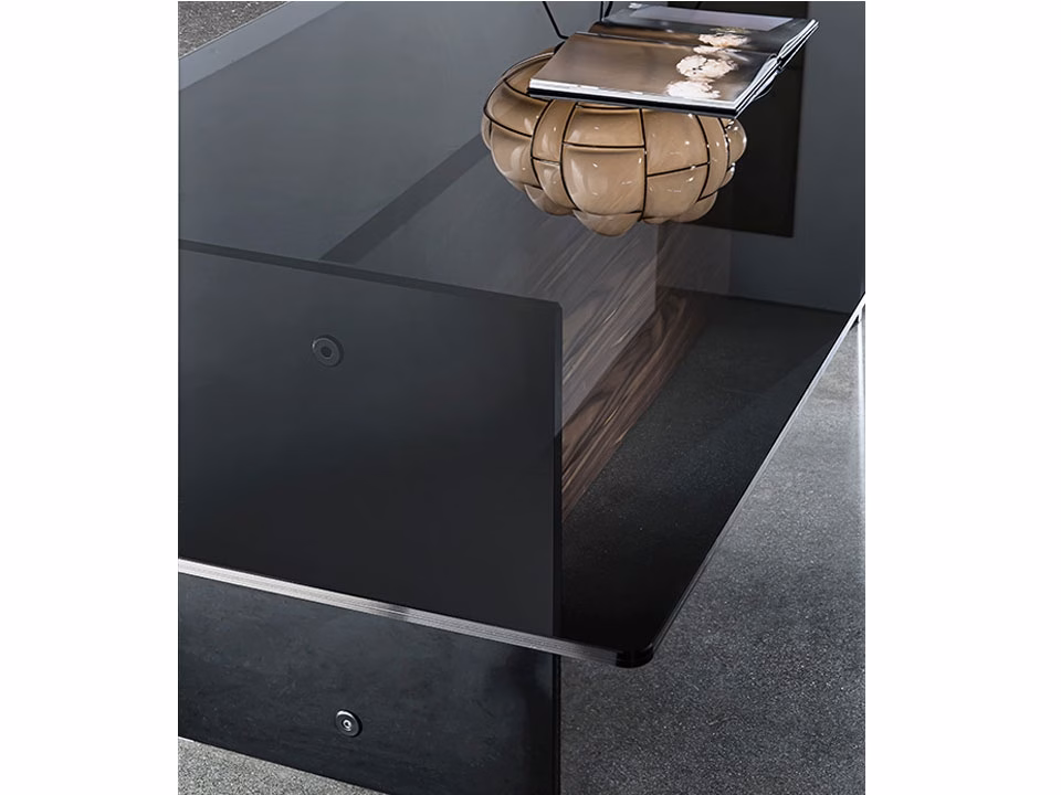 - Wooden element, various finishes, and a black lacquered laminated glass element.