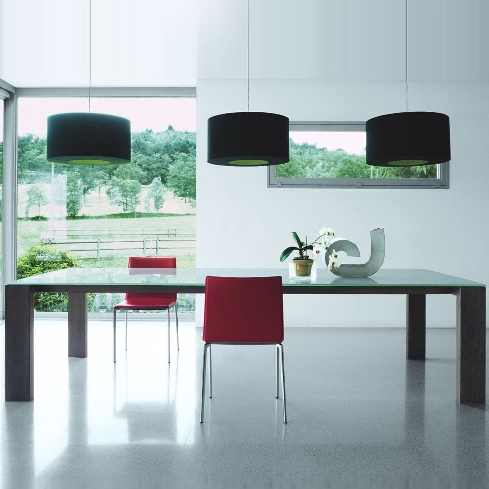 Dining table with legs and structure in veneered wood, various finishes. Tempered glass top, lacquered or frosted lacquered, various finishes. Available also with ceramic top, various finishes.