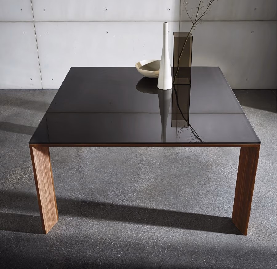 The ceramic or lacquered glass top of Toronto table is supported by a wooden base. The legs with the special “V” profile give a lively visual sense of lightness, while maintaining the solidity and strong presence of the overall structure.