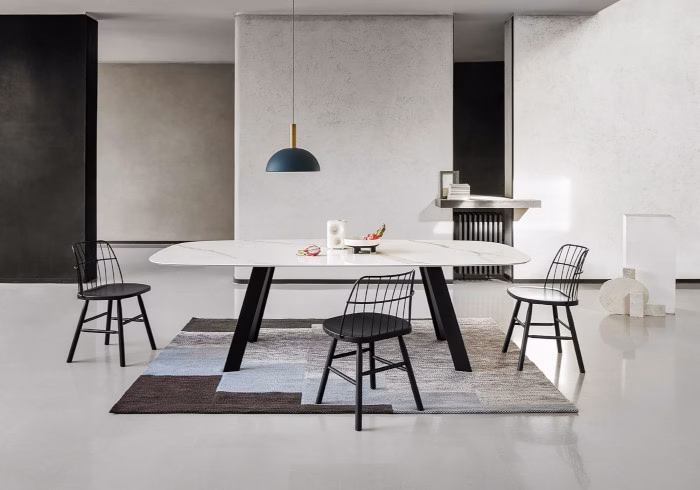Alexander table with four-legs base in lacquered metal available in different sizes. Top available in crystalceramic or solid wood. Wooden top available for 200×106 (78.7×41.7 in) cm and 250×106 cm (98.4×41.7 in) versions. Rectangular top with rounded corners available for 220×116 cm (86.6×45.7 in) and 250×120 cm (98.4×47.2 in) verisons