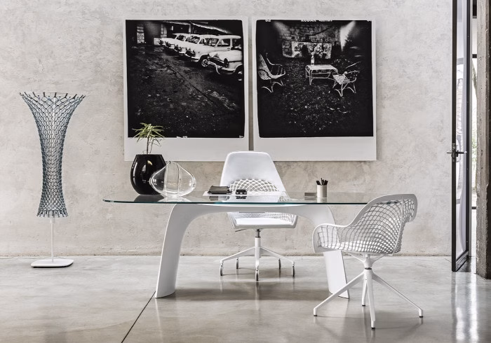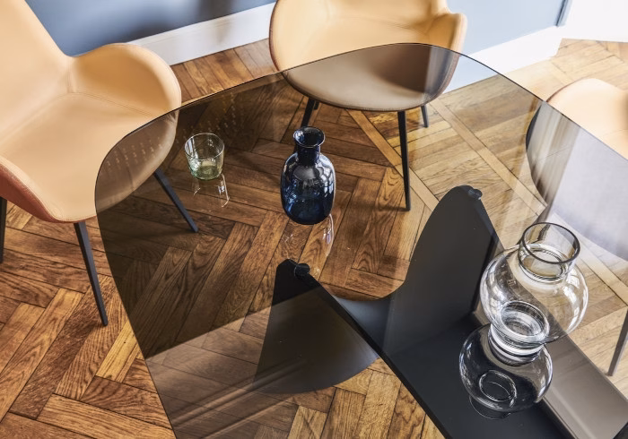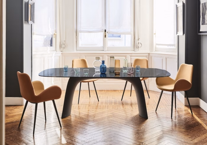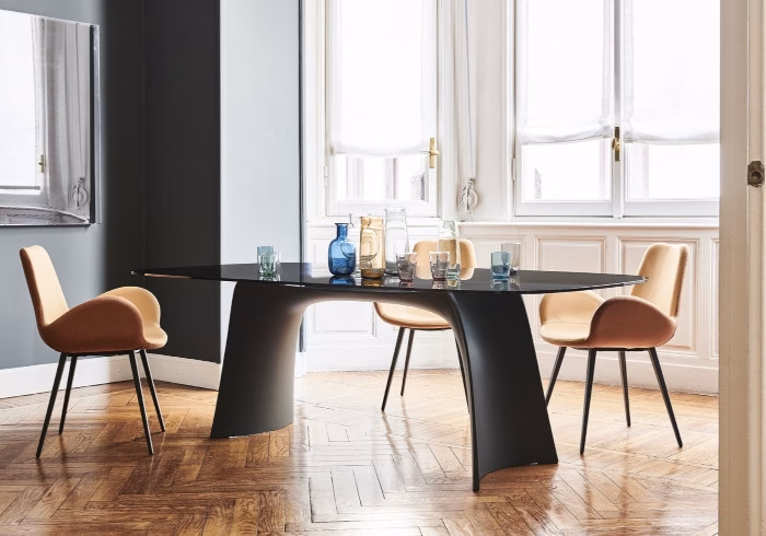 Moonlight fixed table with base in Baydur. Top available in glass or ceramic.