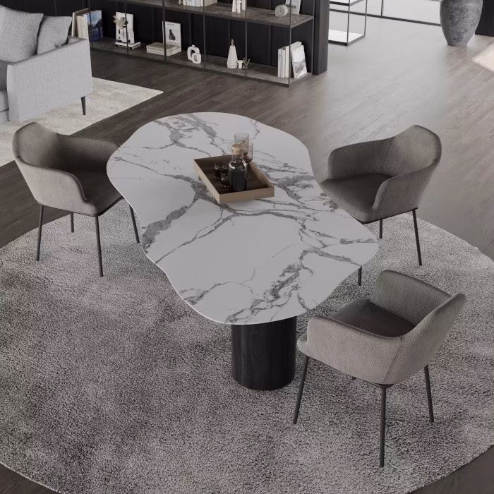 The Como dining table exudes modern elegance with its unique dual round pillar legs, where one stands taller than the other, creating a captivating asymmetry. Its versatile design offers a selection of tabletop shapes, inviting a touch of personal style to any dining space.