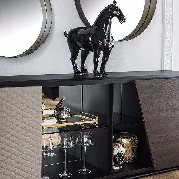 Sideboard in lacquered titanium (GF11) or black (GF73) embossed wood. Titanium (GFM11) or black (GFM73) embossed steel base. Left door covered and quilted in synthetic leather or soft leather as per sample card with embossed titanium (GFM11) aluminum profiles. Central section with mirror. Right door in Canaletto walnut (NC), burned oak (RB) or Brushed Bronze with black chrome (06) details. Internal fumé glass shelves.
