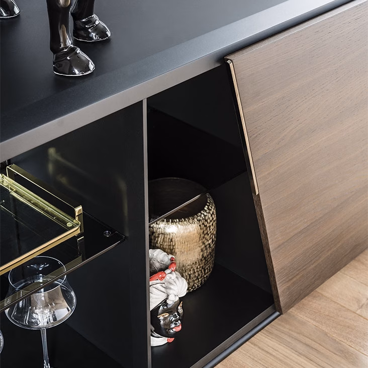 The fascinating collection of Aston furnishes consist of an amazing sideboard and a TV stand which add personality to the living room, making it unforgettable. The peculiarity of the Aston design sideboard and modern TV stand lies in the combination of a variety of materials and exquisite finishes, which give rise to a sophisticated composition that is perfectly balanced and functional at the same time. The central exposed shelves allow to further decorate the room, highlighting one’s most cherished objects. This modern living room set of furniture is made up of refined materials such as wood, metal, leather and synthetic leather that are blended together seameasly thanks to a skilful craftsmanship. Thanks to their fine manufacturing and their incisive design, these products constitute a contemporary yet refined design family.