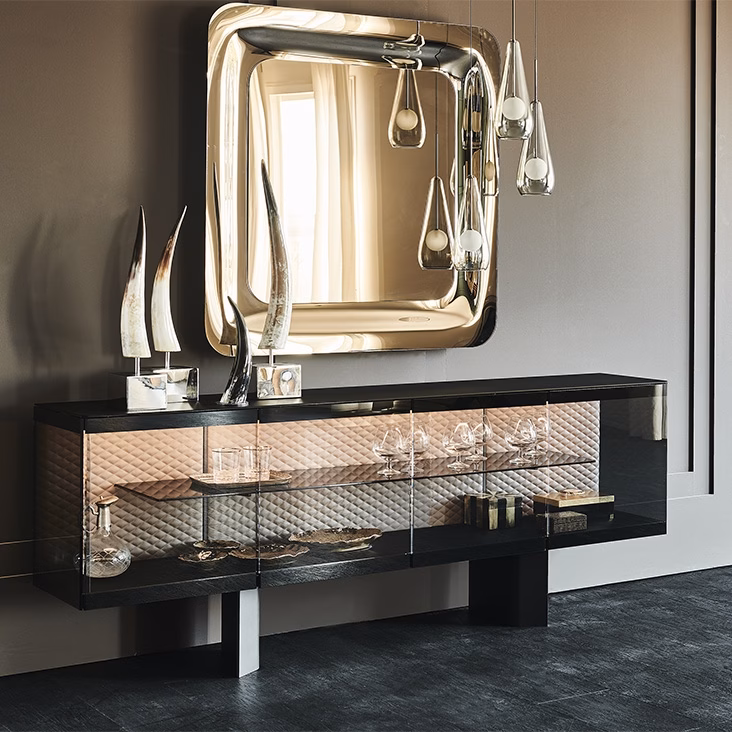 The most valuable items are displayed and preserved at once by the exquisite Boutique sideboard, conceived by Alberto Danese. The internal glass shelves, the quilted upholstered backrest, and the LED lights are all details desiged to valorize the objets that are kept inside this design cabinet, that decorates the living area with refined taste. The Boutique modern sideboard collection consist of two 4-doors versions with different heights, and of the higher 3-shelves sideboard Boutique Alta.