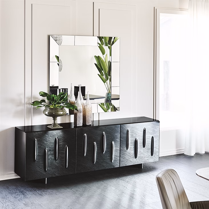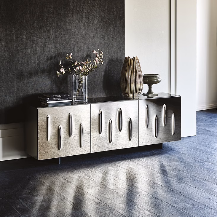 Sideboard 2 or 3 doors lacquered glossy moka (L4), glossy white (L7), matt white (OP7), matt graphite (OP69) or titanium (M11). Doors in smoked grey or bronze convex mirrored glass with embossed titanium (GFM11) aluminum profiles. Polished stainless steel feet, matt graphite (OP69) or white (OP71) varnished. Internal clear glass shelves. Optional: internal drawer in each door. Optional: mirrored glass top matching the doors colour.