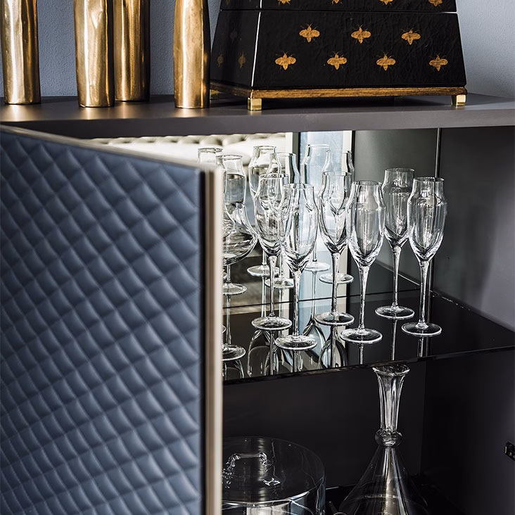 Sideboard in lacquered graphite (GF69), white (GF71) or black (GF73) embossed wood. Embossed steel base in the same color. Doors covered and quilted in synthetic leather or soft leather as per sample card with embossed titanium (GFM11) aluminum profiles. Partially mirrored inside and fumé glass shelves. Optional: internal led light kit.