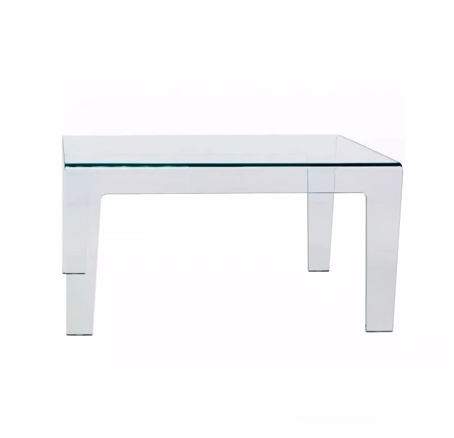 Frog tables are made from a single glass sheet curved and shaped with skillful technique. The purity of its design belies its exceptional strength for each setting and use, thanks to the use of a very thick bent glass.