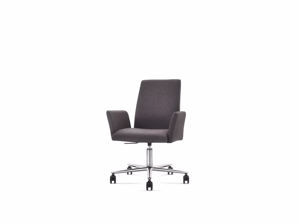 Upholstered chair and armchair with a rigorous and clean design, with a swivel polished aluminium base 5 ways with wheels. Ideal for work environments. Available in leather , eco-leather or fabric. Cover not removable.