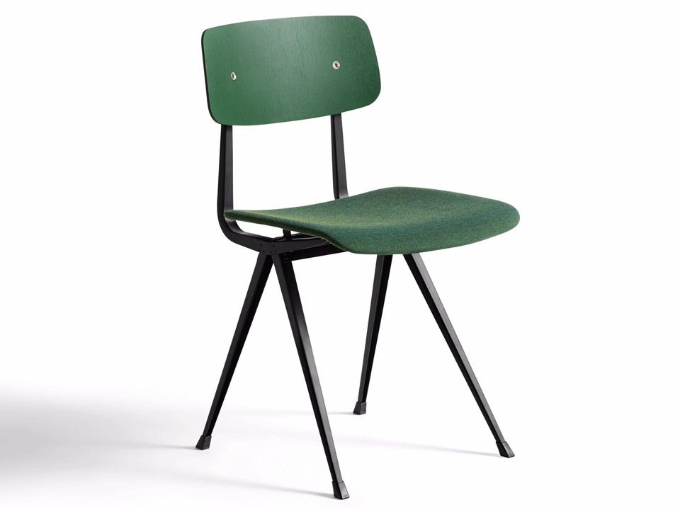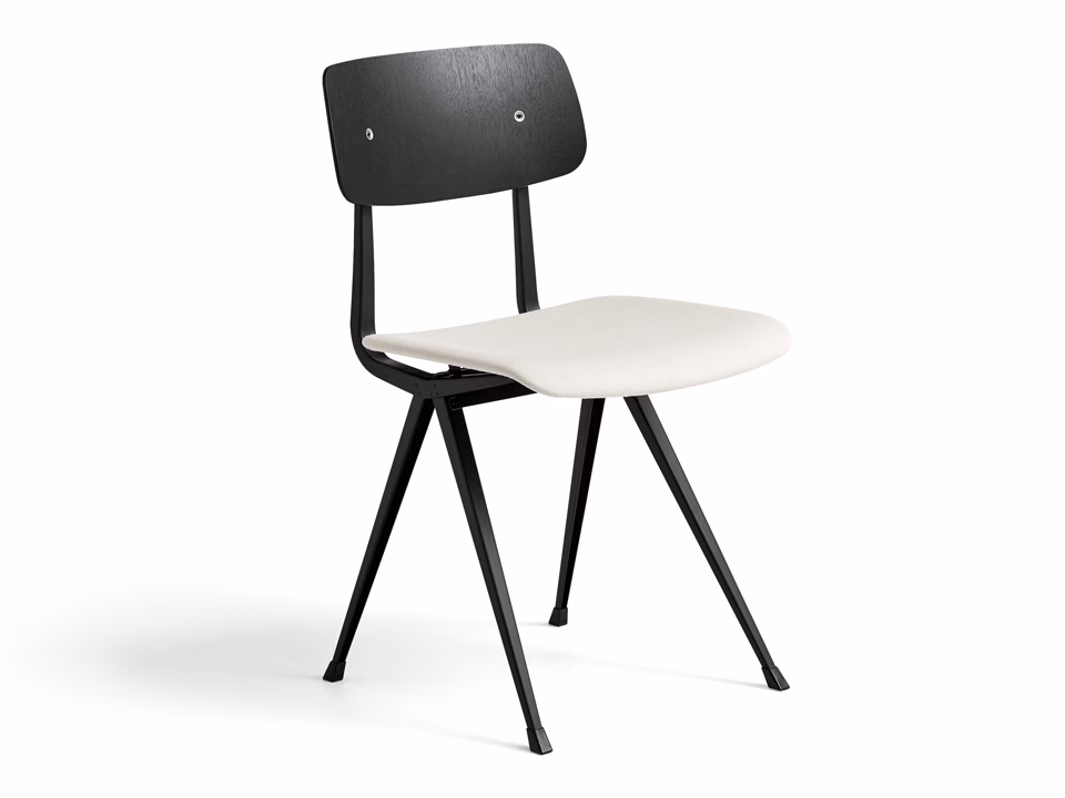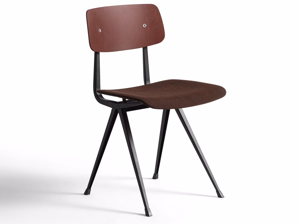 - Material: Moulded plywood seat and back. Top veneer in oak. Seat upholstery with 10 mm foam. Steel sheet legs. Colour of back and legs as Result Chair.