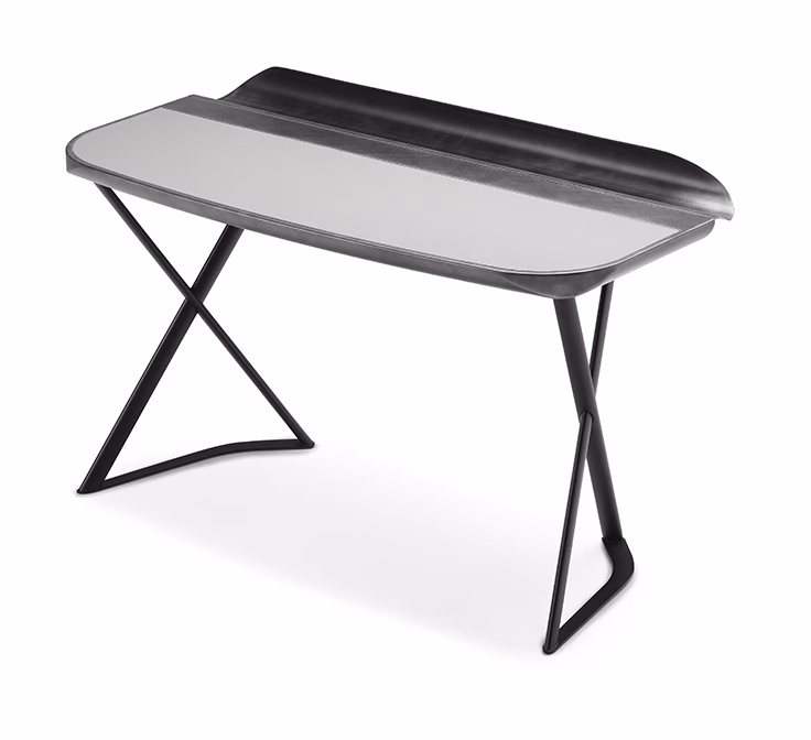 Desk with base in titanium (GFM11), bronze (GFM18) or black (GFM73) embossed lacquered steel. Top in leather as per sample card with Brushed Bronze or Brushed Grey lacquered and rounded lower profile and grooved tray in Brushed Bronze or Brushed Grey lacquered steel.