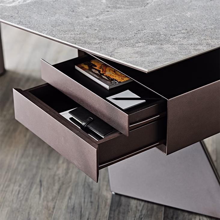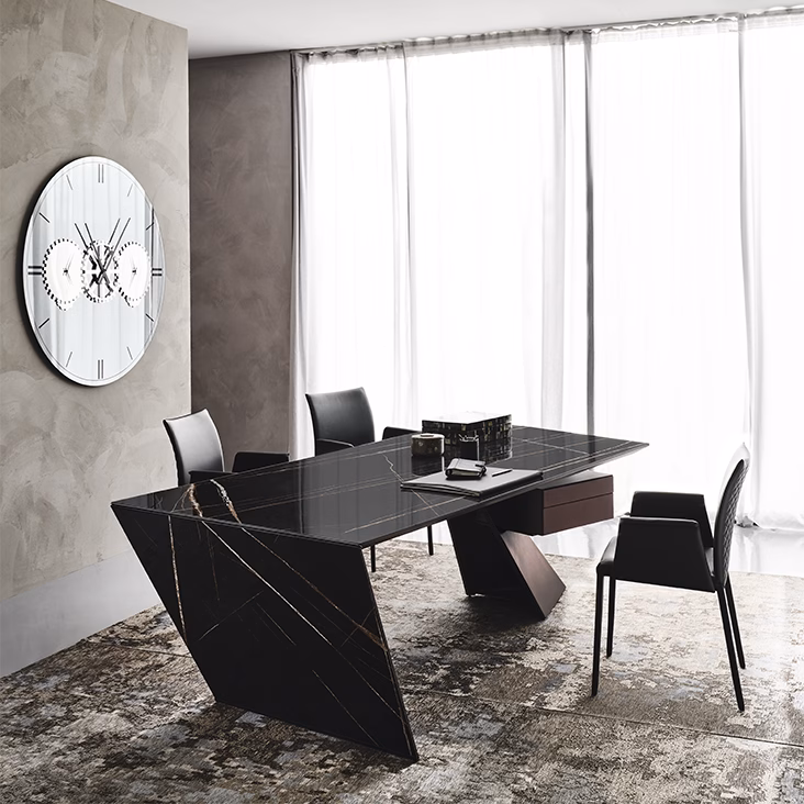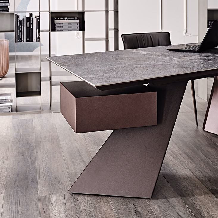 The Nasdaq Keramik modern office desk is a combination of geometrical shapes and materials with a monolith effect. The wooden drawer defies gravity, being laid on the steel leg which incises the space with a powerful diagonal. The top Marmi ceramic finish has a continuous vein, between the top and the side, which enhances the architectural identity of the desk.