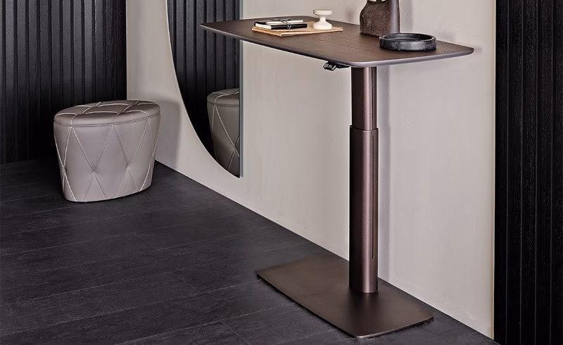 Desk with electrically adjustable height. Frame in titanium (GFM11) or bronze (GFM18) embossed lacquered steel. Top in Canaletto walnut (NC) or burned oak (RB).