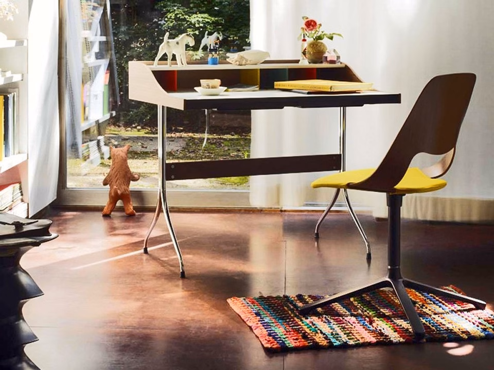 High-quality materials emphasise the graceful refinement of the Home Desk by George Nelson, originally designed in 1958 as a lady’s writing table. Today the compact desk tends to be used in home offices, where it adds an appealing decorative accent with its multicoloured compartments.