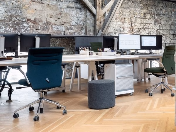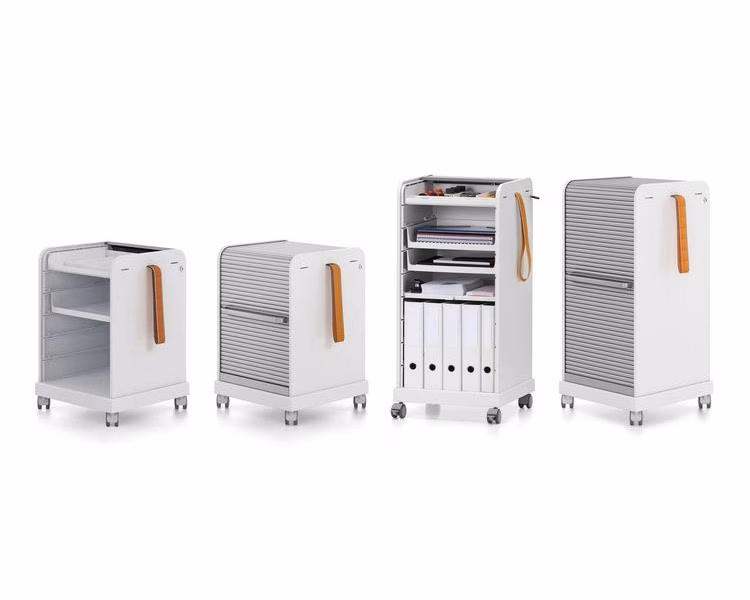 Follow Me 1 and 2 are robust, lockable mobile pedestals for use in the office as well as the home. A decorative pull strap makes it easy to move the trolleys from place to place. One (Follow Me 1) or two (Follow Me 2) shelf spaces for ring binders and an integrated storage compartment with removable trays for papers and personal belongings can be concealed by pulling down the mobile pedestal’s tambour shutter. Both models can also be individually configured with optional drawers and shelves. The taller Follow Me 2 version makes an ideal companion for standing-height tables