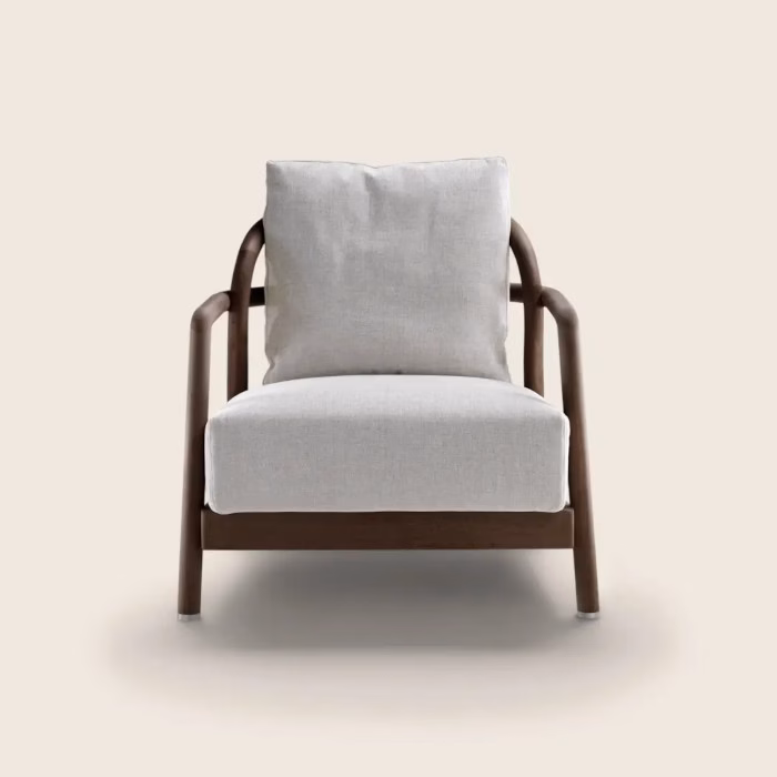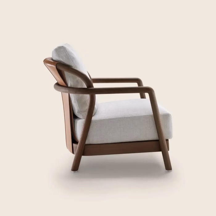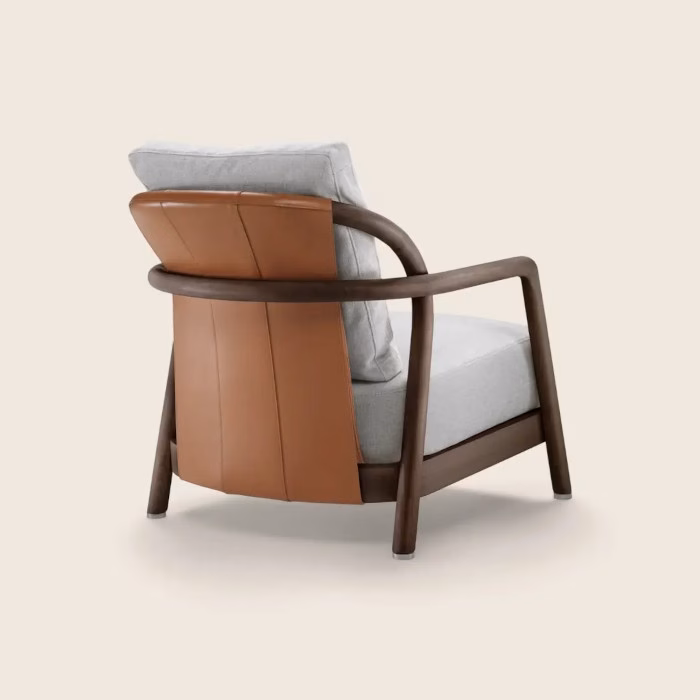 The Alison armchair draws upon Scandinavian design tradition, reinterpreting it through a completely contemporary lens. The sinuously curved structure is made of solid wood and the seat is generously padded. The saddle hide seat back provides optimal support. The combinations of materials and colors can be as endless as they are unique by marrying the structure in solid wood, stained in many shades, with the seat back in saddle hide, available in an array of colors, and the padded seat that can be upholstered in any of the exclusive fabrics and leathers from the Flexform collection. Thanks to its scaled-down proportions and timeless charm, the Alison armchair is supremely at home in any setting.