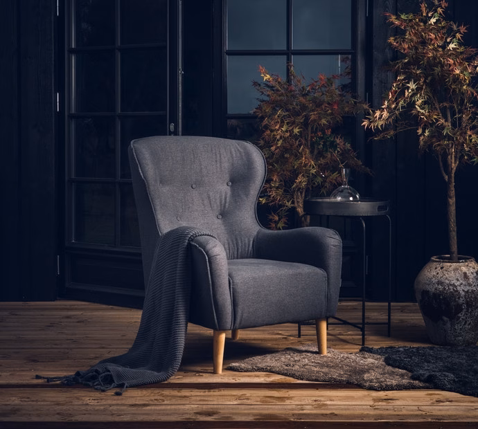 A retro inspired curved armchair with a twist. Sweeping lines and lots of beautiful details such as buttons in the back and creases on the armrest make this a delightful part of any room in your home.ell