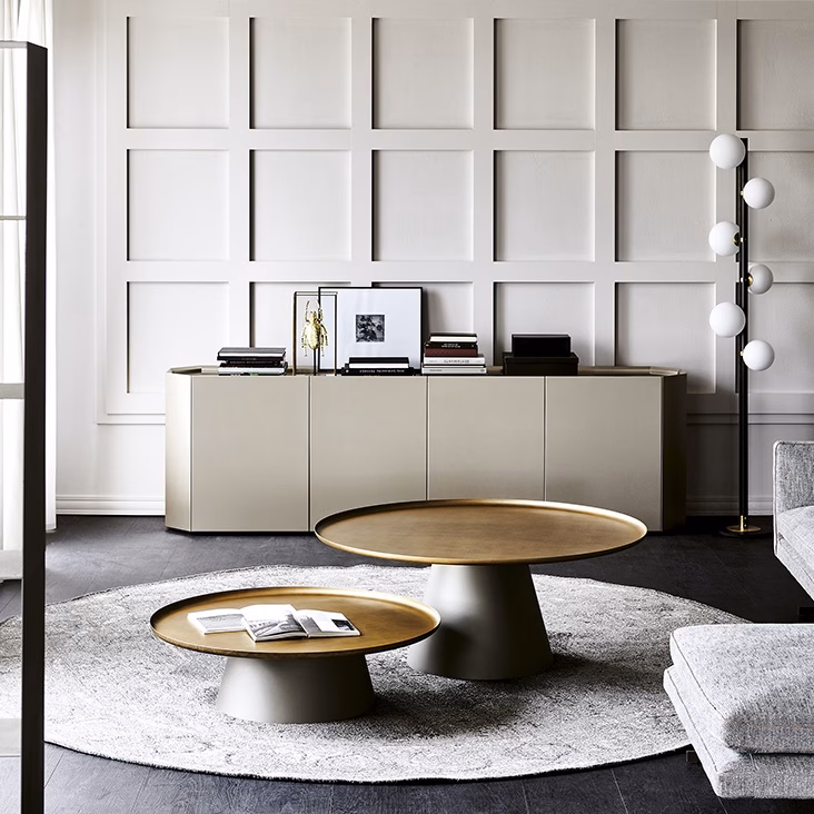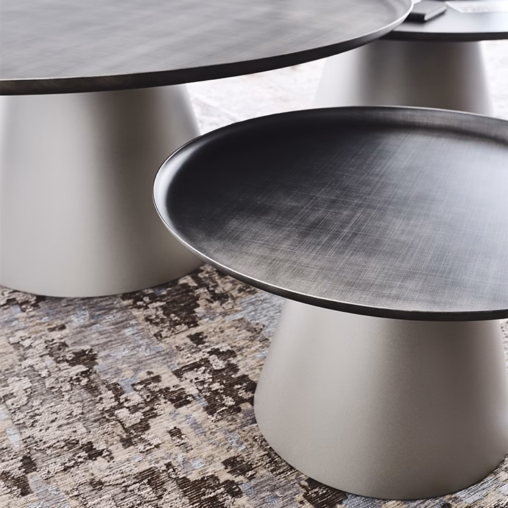 Coffee table with base in titanium embossed lacquered steel (GFM11) and top in Brushed Brass, Brushed Bronze or Brushed Grey lacquered steel.