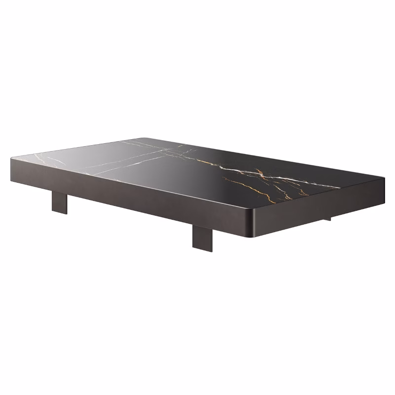 The Jazz coffee tables feature a formal linear design, which comes in a rectangular or round version. They have a spacious surface area that showcases the typical decorative objects featured in living rooms. Jazz coffee tables are almost at floor level, slightly raised on metal feet with a highly geometric shape. The imposing table top, available in glass or ceramic, is outlined by a metal edge which contrasts with the almost invisible base.