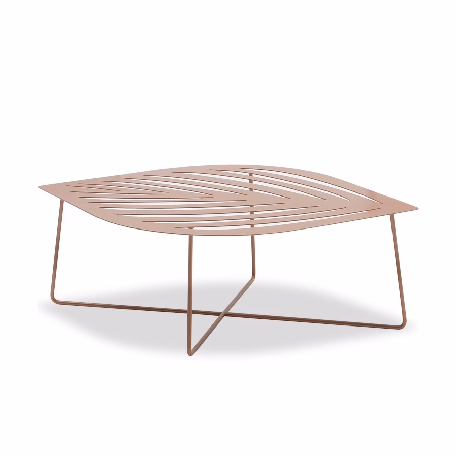 Nature and lightness are the main sources of inspiration for Leaf. Available in three different sizes (high, medium, low), the Leaf coffee tables are made with a solid or perforated sheet with a decorative pattern that brings to mind the veins of leaves. The top, very thin, rests on legs in crossed iron rod, which give an additional sense of lightness to objects with a clean and essential profile. The Leaf coffee tables are made of matt painted metal in multiple colours or in refined matt copper and matt brass finishes. Arranged in groups, or used