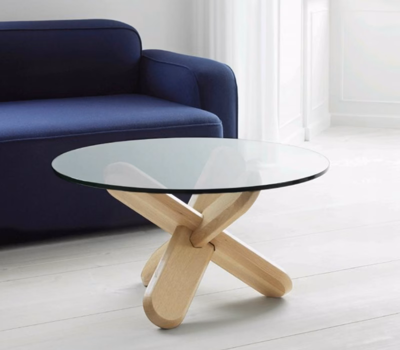 The Ding table is inspired by ancient three-dimensional wooden brain teaser puzzles. The table consists quite simply of three legs made from oak have that are assembled without screws and tools of any kind.When put together they constitute a sculptural knot that works as the base for an exclusive glass tabletop. The legs are rounded off with chamfered edges, making the table stand sturdily on the floor and the round sheet of glass sit solidly on the base.