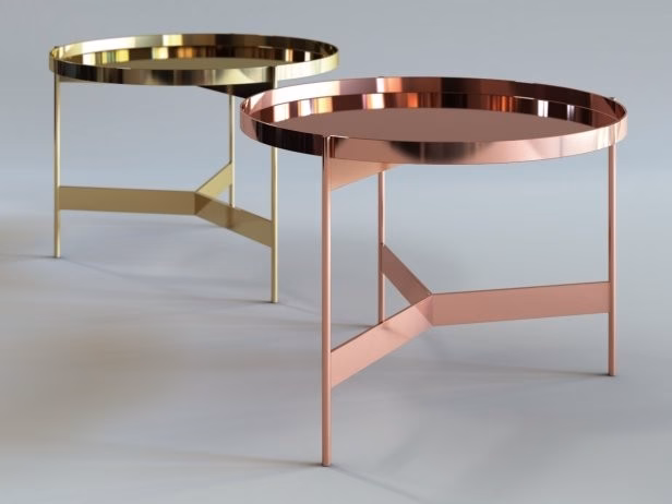 The base is composed of three slender metal legs, connected by a spoked structure that also supports the top, which can be raised for use as a handy tray, separated from the structure by a simple gesture.