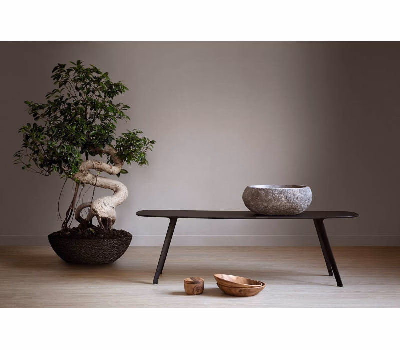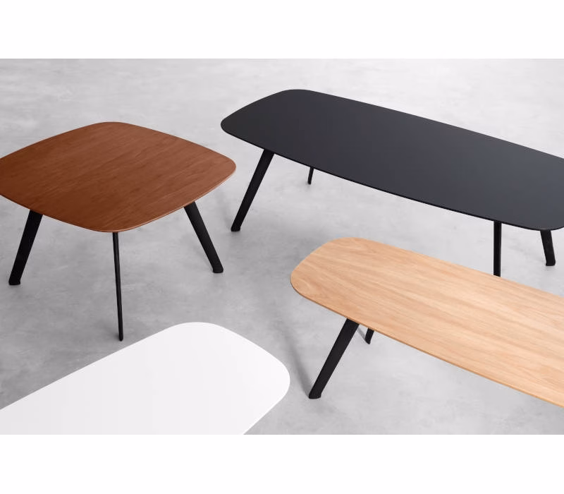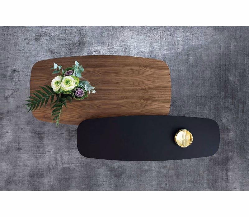 Solapa tables in wood are made with walnut and oak veneer. The white Solapa tabletops are made of white laminate that has a white lacquered finish. Black tabletops are made of Fenix, a unique nanotech material with soft touch, super opaque finish, anti-fingerprint, resistant to scratches and that can thermically heal micro-scratches.