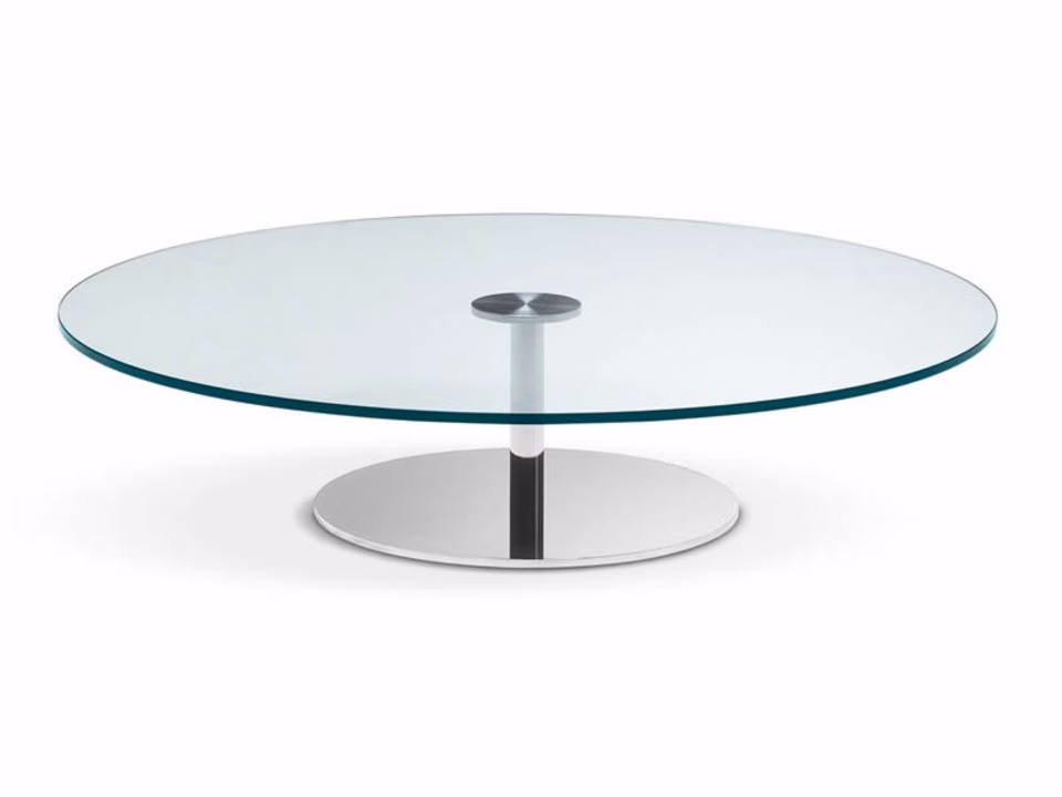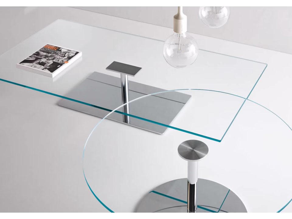 Flashes of light and three-dimensional effects, thanks to the mirrored chrome finish of the base and support. Three versions available: with round, rectangular or square base and top. Glass top available in Ral color.