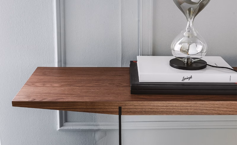 Also perfect for furnishing an entrance hall, the design console Trevi is a functional piece of furniture that adapts in a versatile way to different rooms and household needs. From a stylistic point of view, Trevi stands out for the care taken in its design and the quality and selection of its raw materials. This modern wooden console features a refined shaped top with different thicknesses, supported by the painted steel base, the smooth industrial surface of which creates a pleasant contrast with the natural grain of the wood.