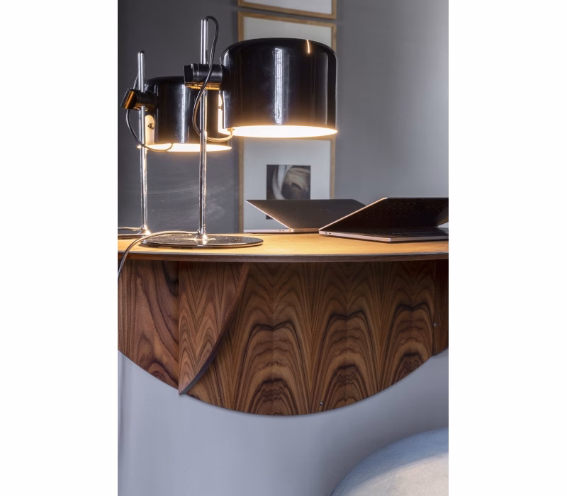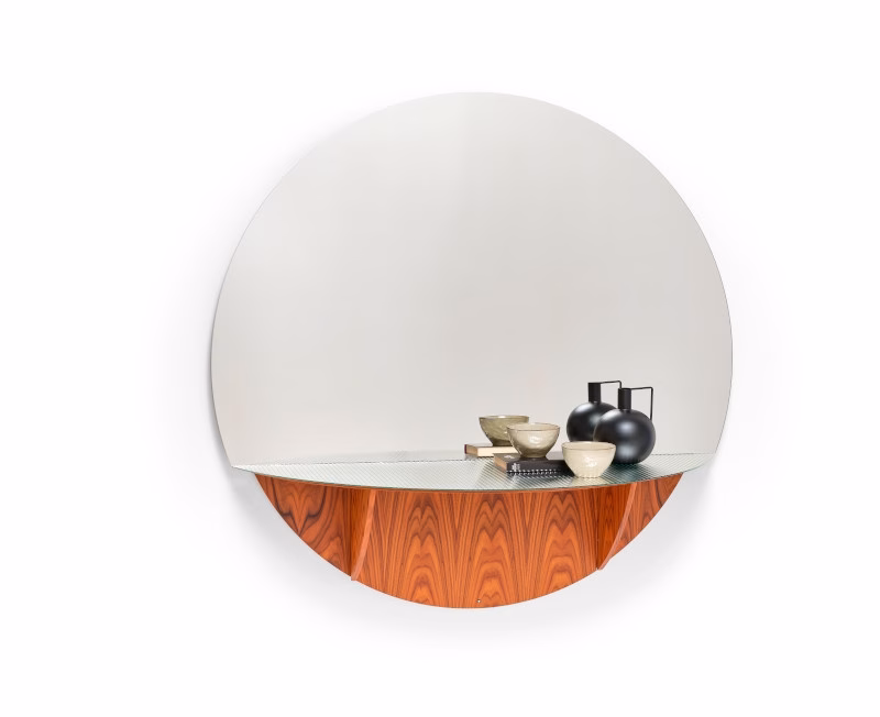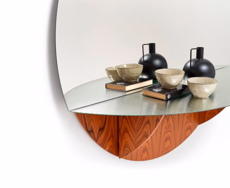 Mirror that becomes a console thanks to the folding top, a functional element in the entrance area, discreet and intimate in the sleeping area. With a minimal design, adorn by the elegant combination of the proposed finishes.