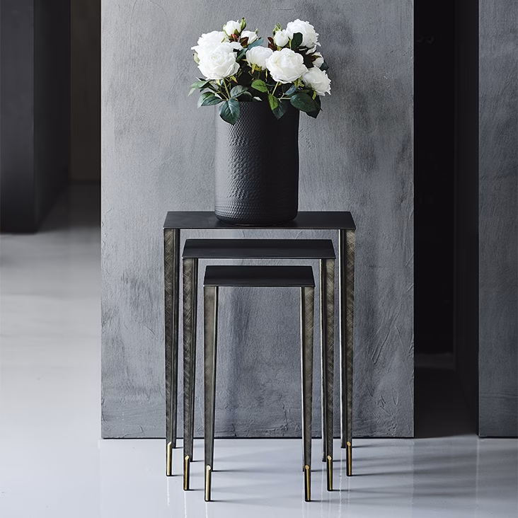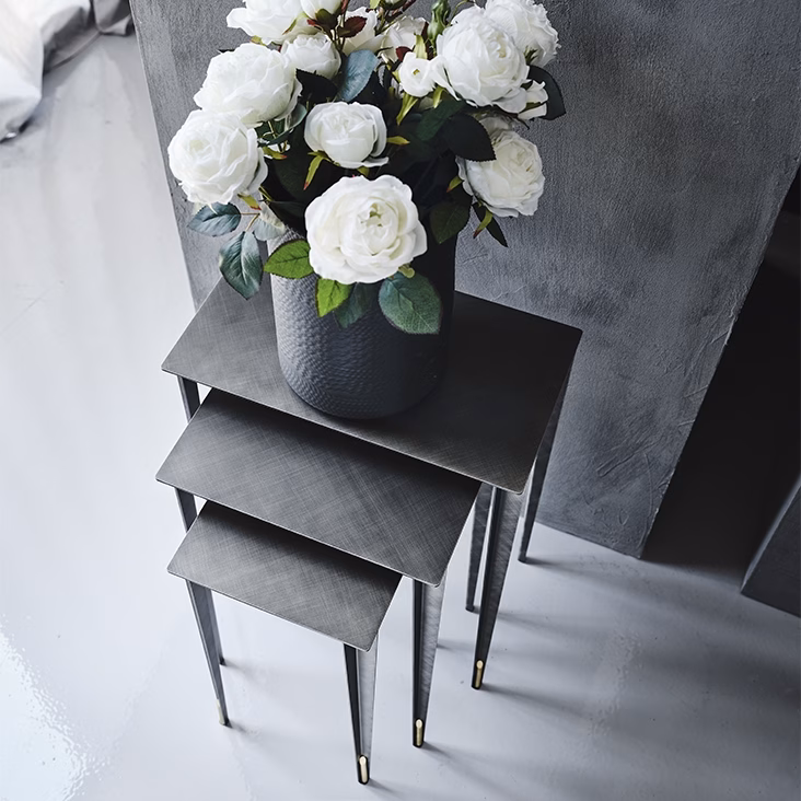A set of 3 side tables with structure in Brushed Brass, Brushed Bronze or Brushed Grey lacquered steel and brass details.