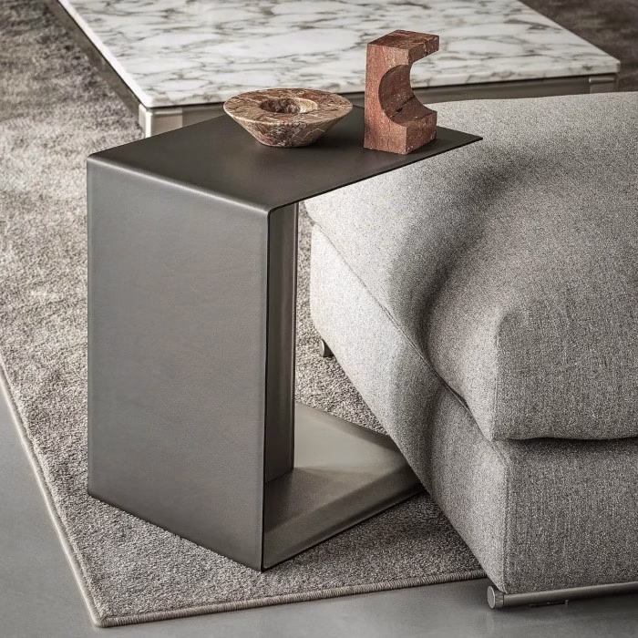 With its sleek, uncluttered geometric C-shape, Plain is a handy tray table designed to be placed alongside or in front of the sofa. Form and function combine seamlessly and its uncluttered lines provide the perfect foil for a luxurious material like cowhide. The metal structure of the Plain side table is entirely clad in cowhide, available in the vast Flexform color palette.