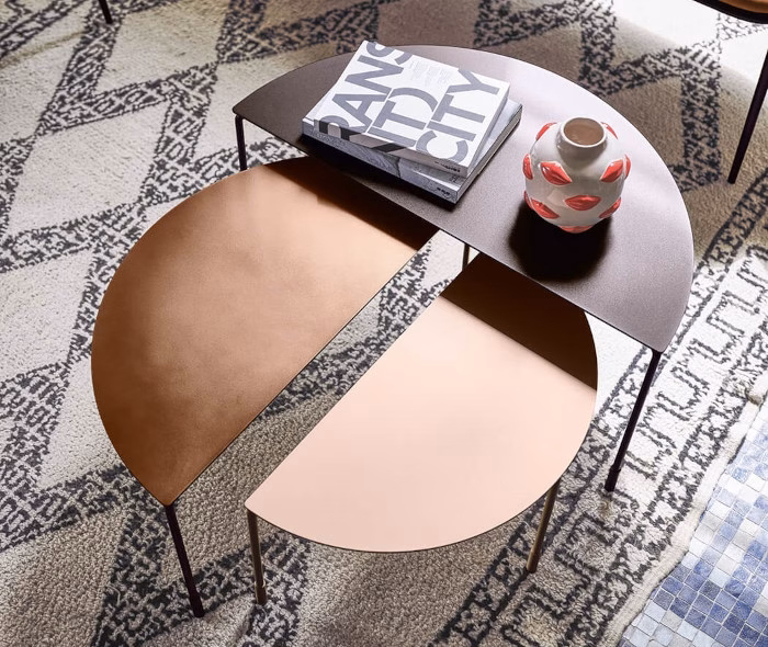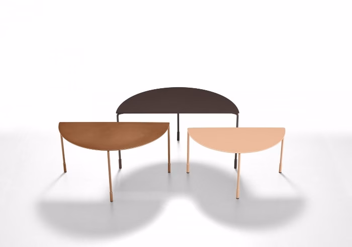 Hoodi coffee table with lacquered metal legs. Top available in metal or upholstered in hide. The Hoodi collection consists of three half-moon shaped coffee tables, with different sizes and heights.